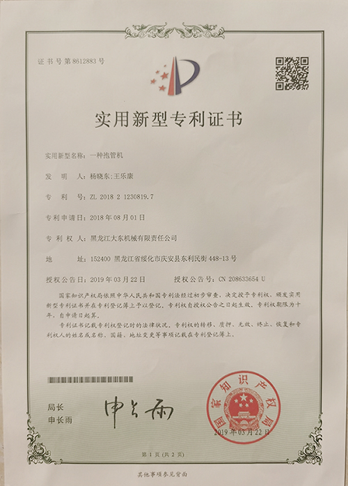 一種抱管機專利證書